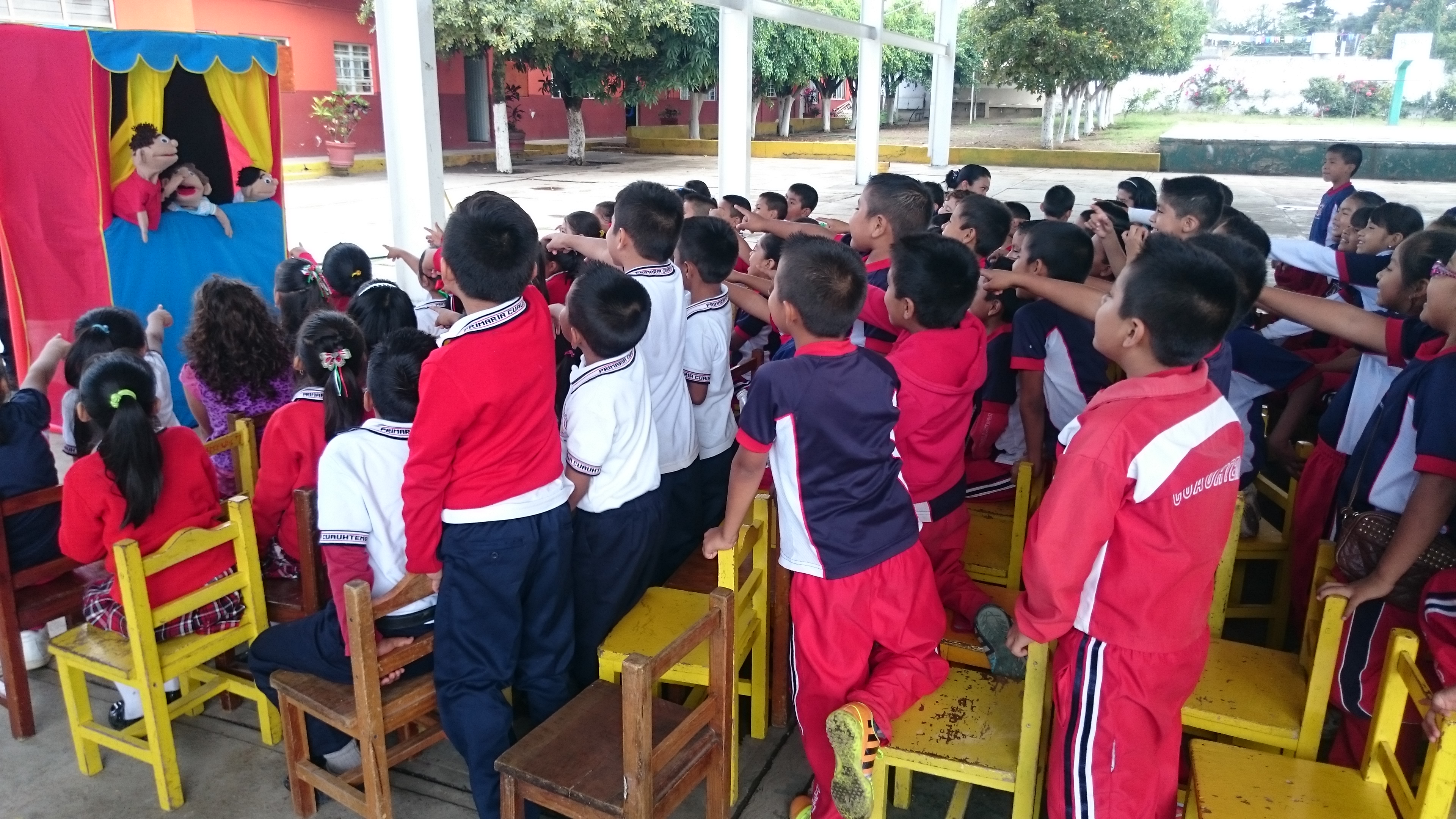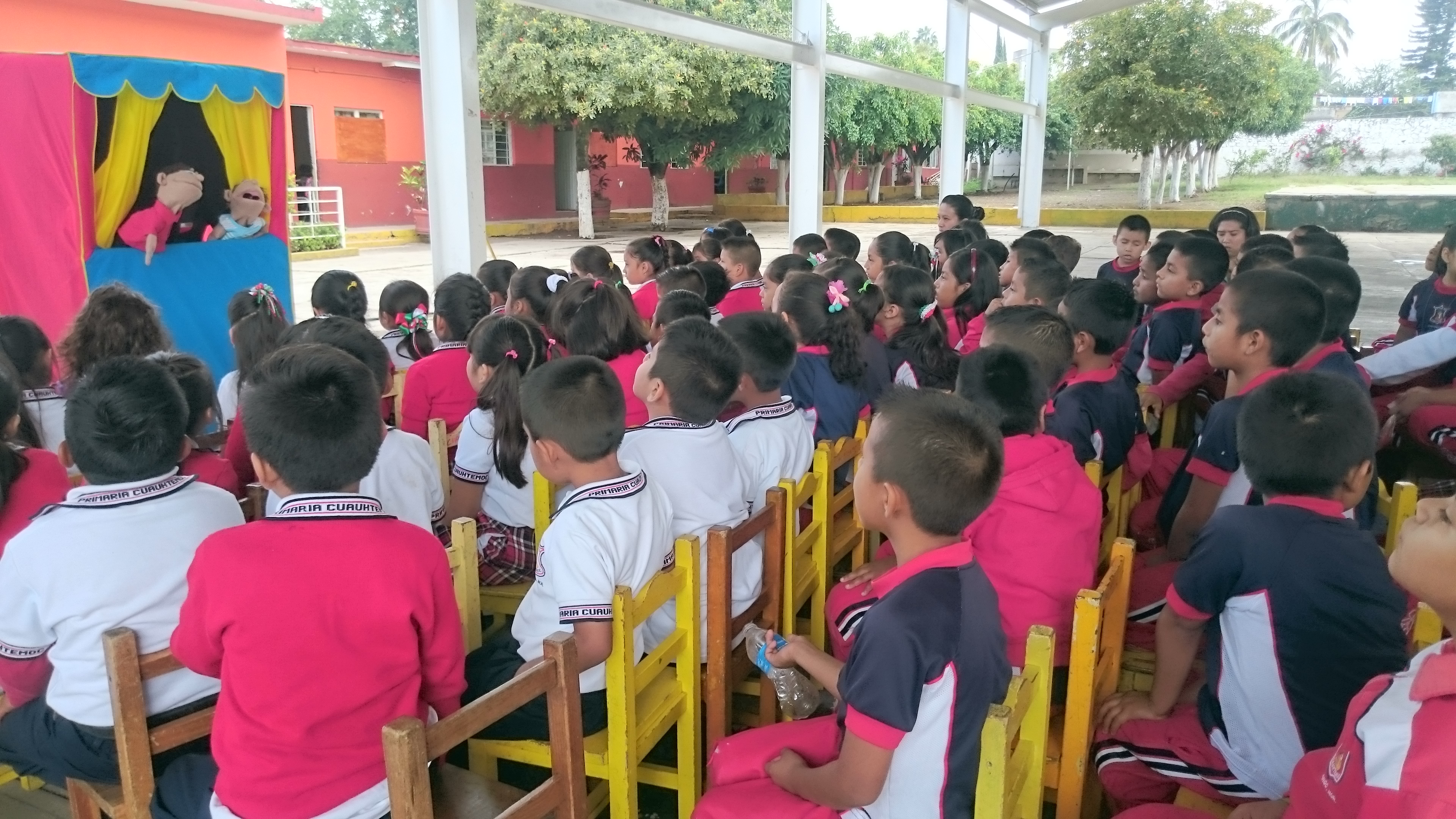 Presentación de un obra de teatro guiñol acerca de los derechos humanos y los derechos de los pueblos indígenas, dirigida a niños y niñas de la escuela primaria Cuauhtémoc y la escuela primaria Nezahualcóyotl en la comunidad de Tetelcingo, municipio de Cuautla, Morelos.